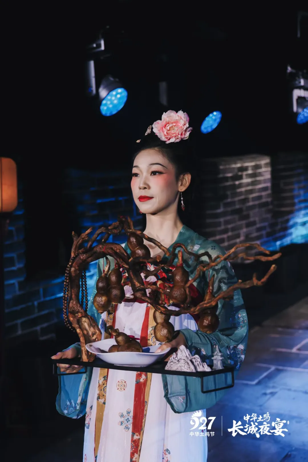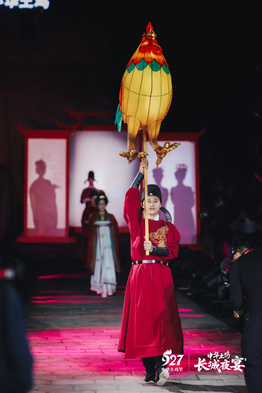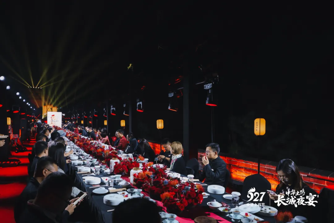 夜幕降临,居庸关长城灯火通明,长桌蜿蜒如龙。近百位嘉宾共同欣赏一场别开生面的“中华土鸡长城夜宴”。